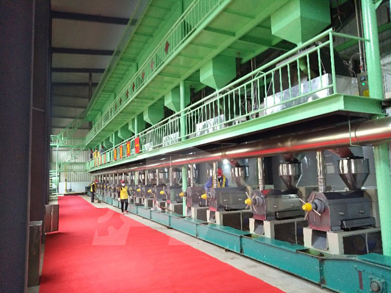 原料經清理、去石、輸送、全自動電磁炒鍋炒料、油和餅分別去不同的地方,一整套生產線實行全自動化生產,極大的提高了生產效率,減少人工支出,減少了人工榨油的不穩定性,該工藝是現代化榨油廠采購榨油設備的優先選擇。